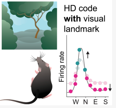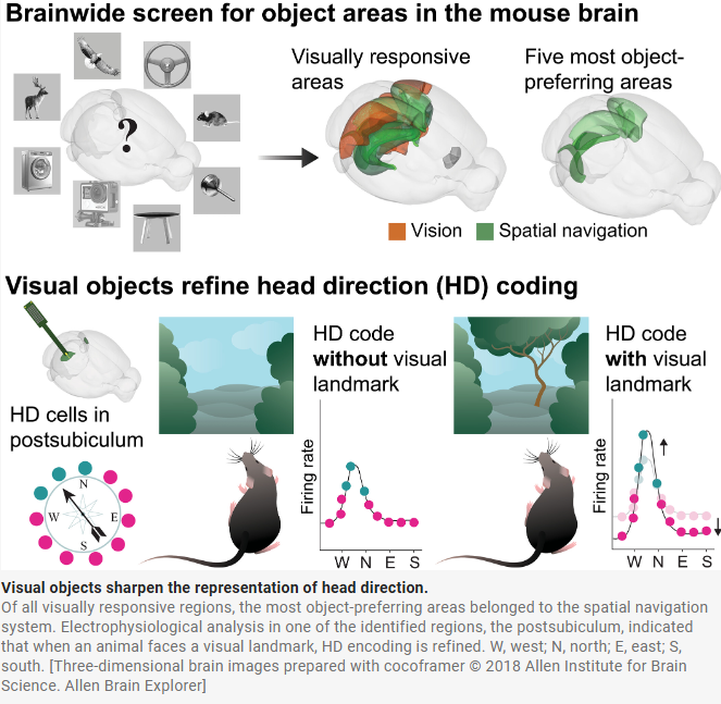 Animals use visual objects to guide navigation-related behaviors. However, visual object-preferring areas have yet to be described in the mouse brain, limiting our understanding of how visual objects affect spatial navigation system processing. Using functional ultrasound imaging, we identified brain areas that were preferentially activated by images of objects compared with their scrambled versions. Whereas visual cortex did not show a preference, areas associated with spatial navigation were preferentially activated by visual objects. Electrophysiological recordings in postsubiculum, the cortical head direction (HD) system hub, confirmed a preference for visual objects in both HD cells and fast-spiking interneurons. In freely moving animals, visual objects increased firing rates of HD cells aligned with a visual object but decreased activity in HD cells coding for other directions.